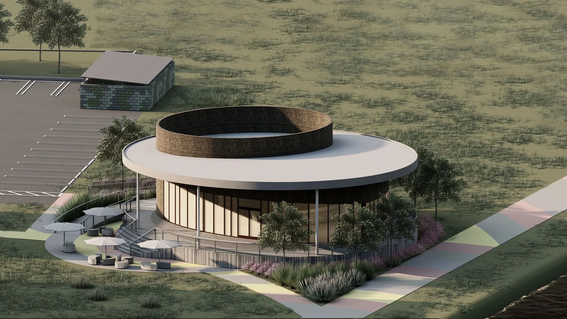 Café form studies for existing performing arts center To the south of the existing Dennis C. Moss cultural arts center sits the concert green outdoor performance space; where outdoor concerts, festivals and art fairs are hosted. The new Café is situated to the rear of the property and overlooks the rear green performance space. The Concert green slopes gently towards the black creek canal to the south. The café’s oval parti is inspired by the raindrops found on the performance theater’s façade treatment. Visitors are sheltered by the oval canopies and the adjacent free form seating.
